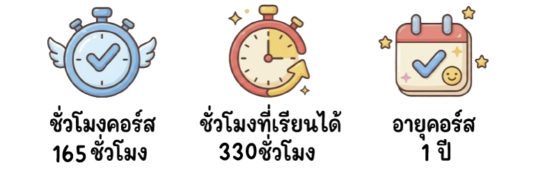 - รวม 165 ชั่วโมง เรียนได้ 330 ชั่วโมง อายุคอร์ส 1 ปี